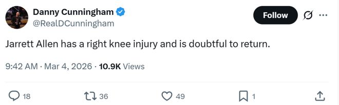艾倫因傷退場,騎士官方宣布他因右膝傷勢本場比賽小概率回歸,最終他并未回歸,全場出戰(zhàn)20分鐘,7中4得到8分3籃板。