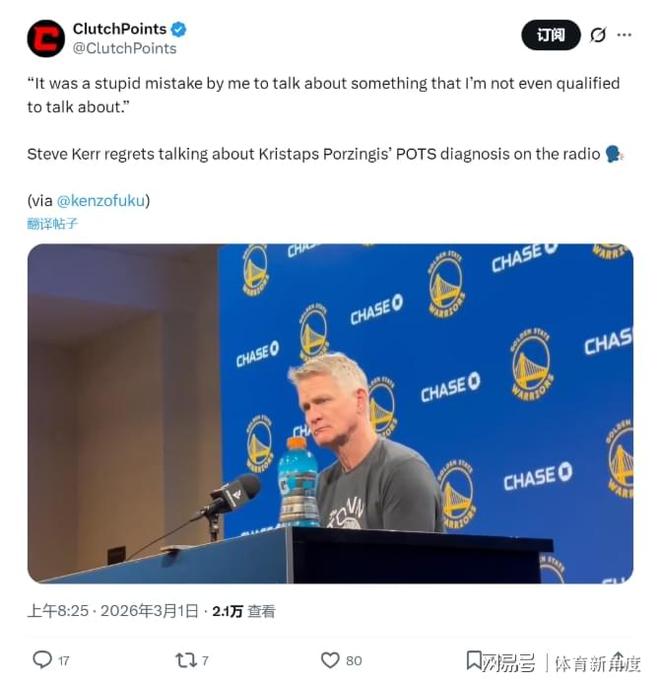 實際上,庫里的傷病尚屬可預(yù)見范疇,勇士隊更為擔(dān)憂的是新援波爾津吉斯的情況。在昨日勇士與快船的比賽中,波爾津吉斯再度缺席。主帥科爾解釋道:“波爾津吉斯的病情頗為復(fù)雜,隊醫(yī)正努力查明其具體病情?!贝饲坝袀髀劮Q,波爾津吉斯所患的“疑難雜癥”可能與體位性心動過速綜合征(POTS)有關(guān),該病癥在他效力于凱爾特人隊時已被查出,屬于自主神經(jīng)功能障礙性疾病。
