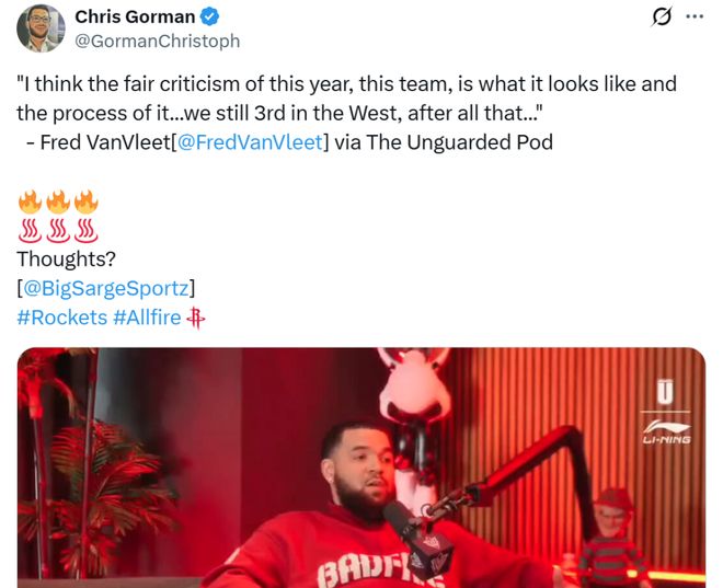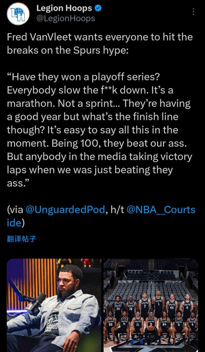 由于遭遇十字韌帶撕裂大傷,范喬丹在養(yǎng)傷期間開啟同名個人播客節(jié)目《Fred VanVleet》銳評聯(lián)盟熱點事件,本賽季狀態(tài)火爆的馬刺隊自然成為其討論的話題之一。
