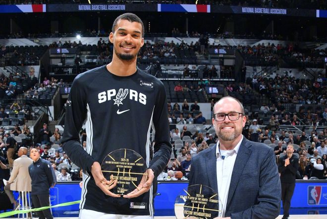 憑借這樣的表現(xiàn),文班賽前才領取了2月份最佳球員+2月份最佳防守球員兩項大獎。