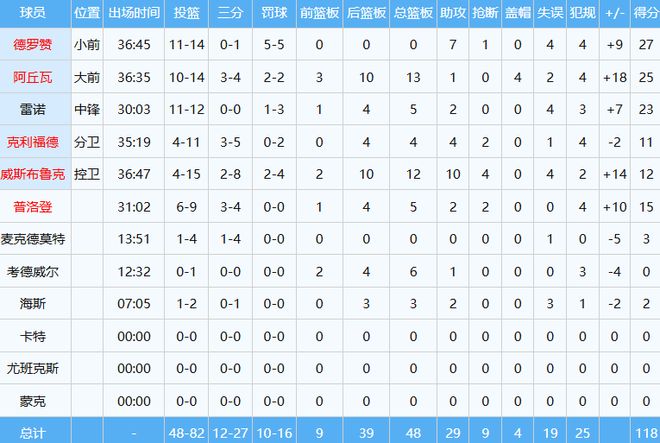 最終西部墊底的國王,在客場118-109爆冷擊敗快船,此役德羅贊進攻極其高效,投籃14中11,以約78.6%命中率貢獻27分外加7助;威少面對老東家,12分12板10助三雙到手并且送出4次搶斷。