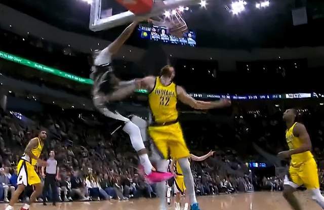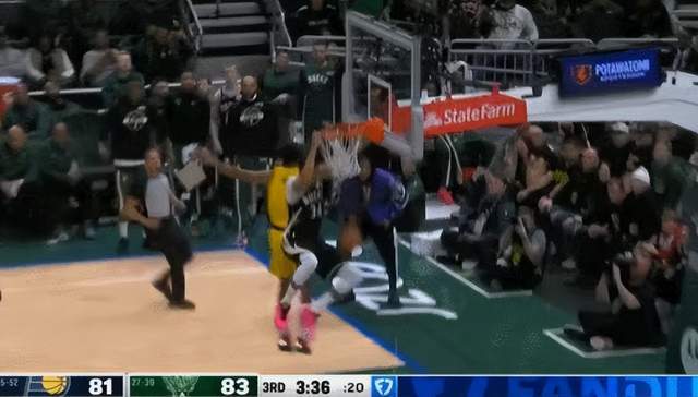 而最離譜的是,出現(xiàn)這種情況之后,字母哥并沒有直接退場(chǎng),在步行者快攻回合結(jié)束后,還留在前場(chǎng)的字母哥接隊(duì)友傳球,加速?zèng)_向籃筐又是一記暴力扣籃。