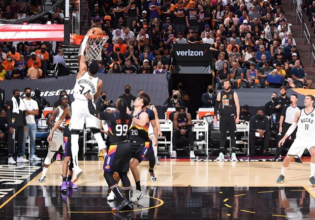 字母哥外線持球,沖擊步行者內(nèi)線,兩人對(duì)抗之后,字母哥轉(zhuǎn)身加速擠進(jìn)禁區(qū),隨后就是一記隔扣。