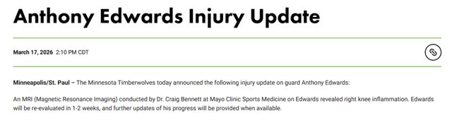 北京時(shí)間3月18日,森林狼隊(duì)官方宣布,安東尼-愛德華茲因右膝酸痛今日將缺戰(zhàn)太陽。他接受了核磁共振檢查,結(jié)果顯示其右膝存在炎癥。據(jù)森林狼方面透露,愛德華茲將在1~2周后接受復(fù)查,后續(xù)情況將在有更新時(shí)對(duì)外公布。