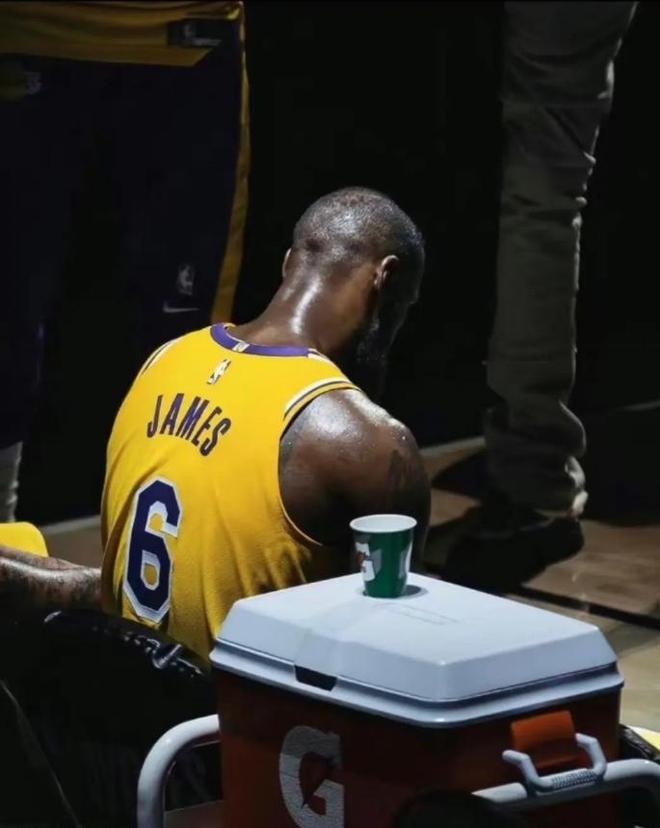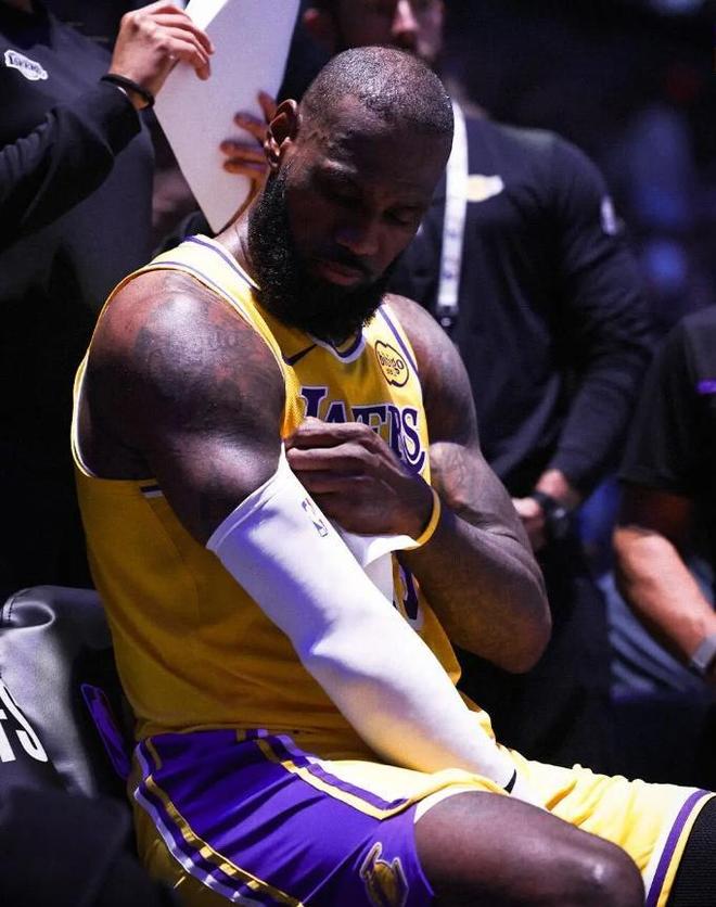 采訪結(jié)束后,詹姆斯匆匆離場,鏡頭捕捉到他右手肘和手腕處已經(jīng)裹上了厚厚的冰袋。