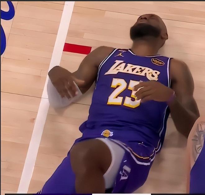 詹姆斯躺在地上緩了好一會兒才起身,表情痛苦。