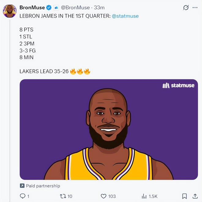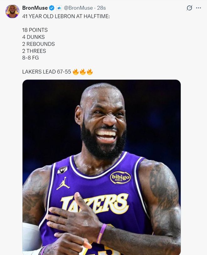 第二節(jié)的勒布朗依舊炸裂,他他的快攻依舊無解,這一節(jié)勒布朗單節(jié)暴扣3次,上半場已經四次暴扣,17分鐘,8中8,三分2中2,在沒有罰球的情況下已經拿到18分2籃板1搶斷1蓋帽,命中率100%,三分命中率100%,他半場已經拿了復出以來的最高分。