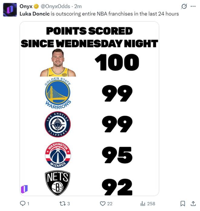數(shù)據(jù)媒體曬出過去24小時東契奇合計(jì)拿到100分,他已經(jīng)比勇士99分、快船99分、奇才95分、籃網(wǎng)92分更多,一支球隊(duì)都不如東契奇24小時內(nèi)拿下的分?jǐn)?shù)多。