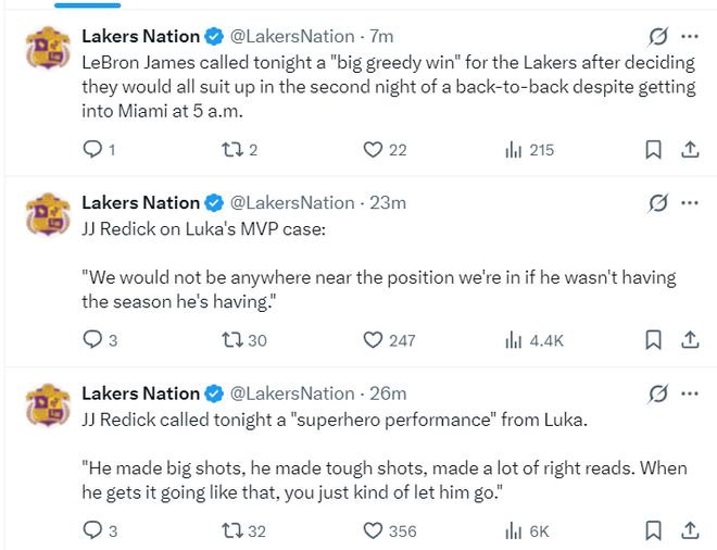 美媒轉(zhuǎn)推湖人盛贊東契奇X詹姆斯后寫道:詹姆斯/東契奇已是雙山羊。