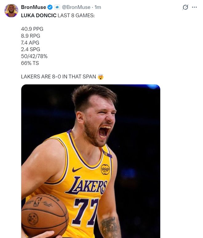湖人是一波八連勝,這一波八連勝期間東契奇場均40.9分8.98籃板7.4助攻2.4搶斷,命中率50%,三分命中率42%,罰球命中率78%,真實(shí)命中率66%,東契奇實(shí)在是太炸裂。