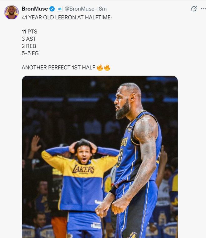 半場(chǎng)詹姆斯5中5,拿到11分3籃板2助攻,命中率100%,41歲的詹姆斯連續(xù)兩個(gè)上半場(chǎng)保持全中!