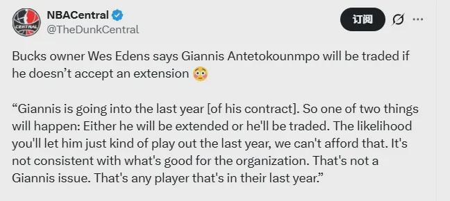 雄鹿老板韋斯-埃登斯接受ESPN采訪時,明確表示下賽季為字母哥的準(zhǔn)合同年(27-28賽季擁有球員選項),球隊不可能承擔(dān)如此風(fēng)險。