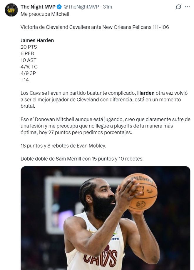 美媒TNM寫道:騎士打了一場很艱難的比賽,哈登再次成為克利夫蘭最出色的球員,米切爾雖然登場了但我覺得他的傷還沒有痊愈,我擔(dān)心他不能以100%的狀態(tài)進(jìn)入季后賽。