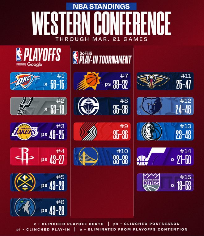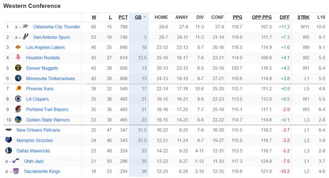 目前西部排名,1-6:雷霆、馬刺(前二鎖定季后賽)、湖人、火箭、掘金、森林狼;
